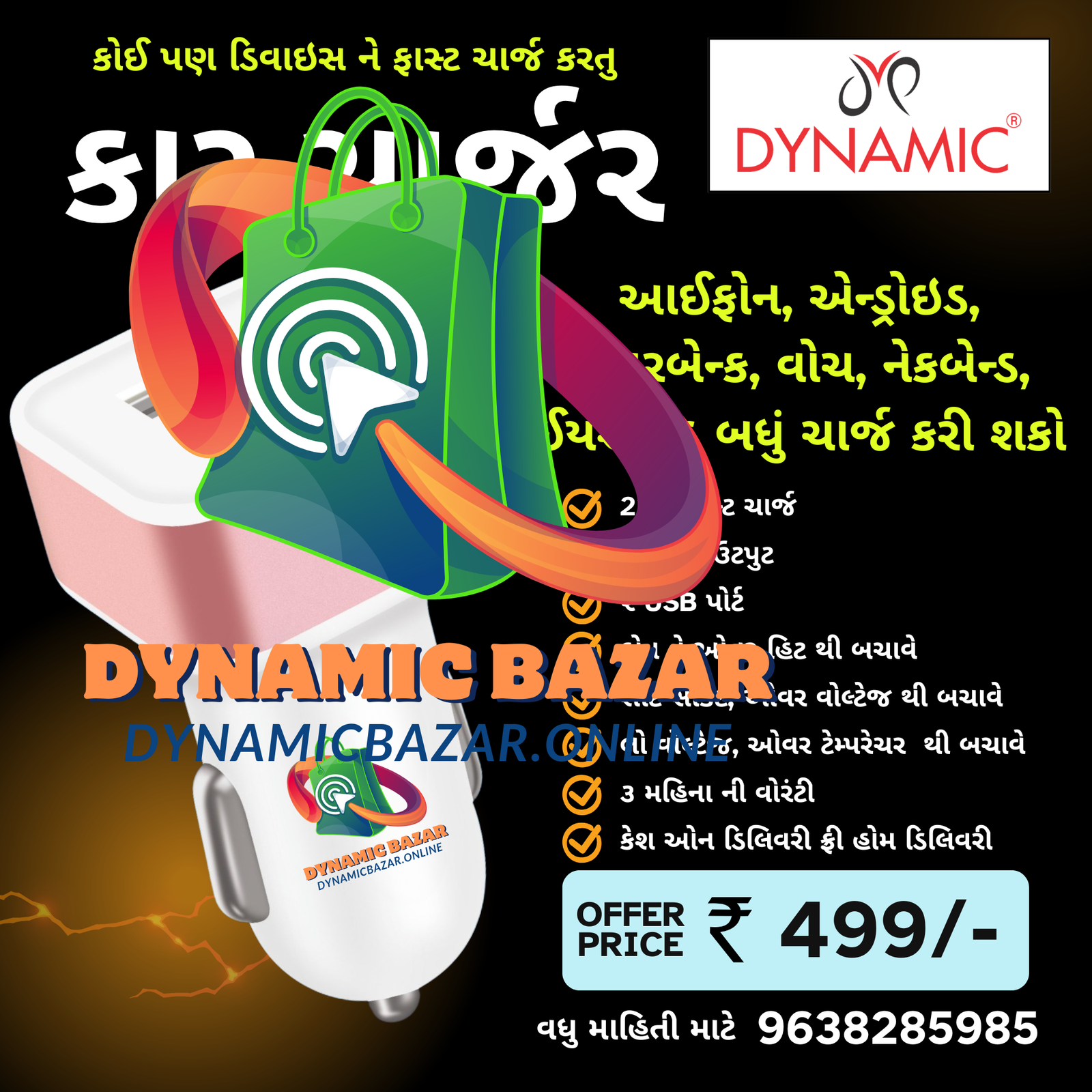 Dynamic Bazar™ 22W ફાસ્ટ કાર ચાર્જર મુસાફરી દરમિયાન શક્તિશાળી, વિશ્વસનીય અને સુરક્ષિત ચાર્જિંગ માટે ડિઝાઇન કરવામાં આવ્યું છે. ડ્યુઅલ USB આઉટપુટ સાથે તમે એક સાથે બે ડિવાઇસ ચાર્જ કરી શકો છો — સ્માર્ટફોન, પાવર બેંક, નેકબેન્ડ, સ્માર્ટવોચ, બ્લૂટૂથ સ્પીકર્સ અને મિની ફેન અથવા ટ્રિમર જેવા નાના ગેજેટ્સ પણ. બિલ્ટ-ઇન સ્માર્ટ IC ચિપ આપમેળે તમારા ડિવાઇસની જરૂરિયાત મુજબ પાવર ઓળખે છે અને ઓવરહીટિંગ વગર સુરક્ષિત ફાસ્ટ ચાર્જિંગ આપે છે.
