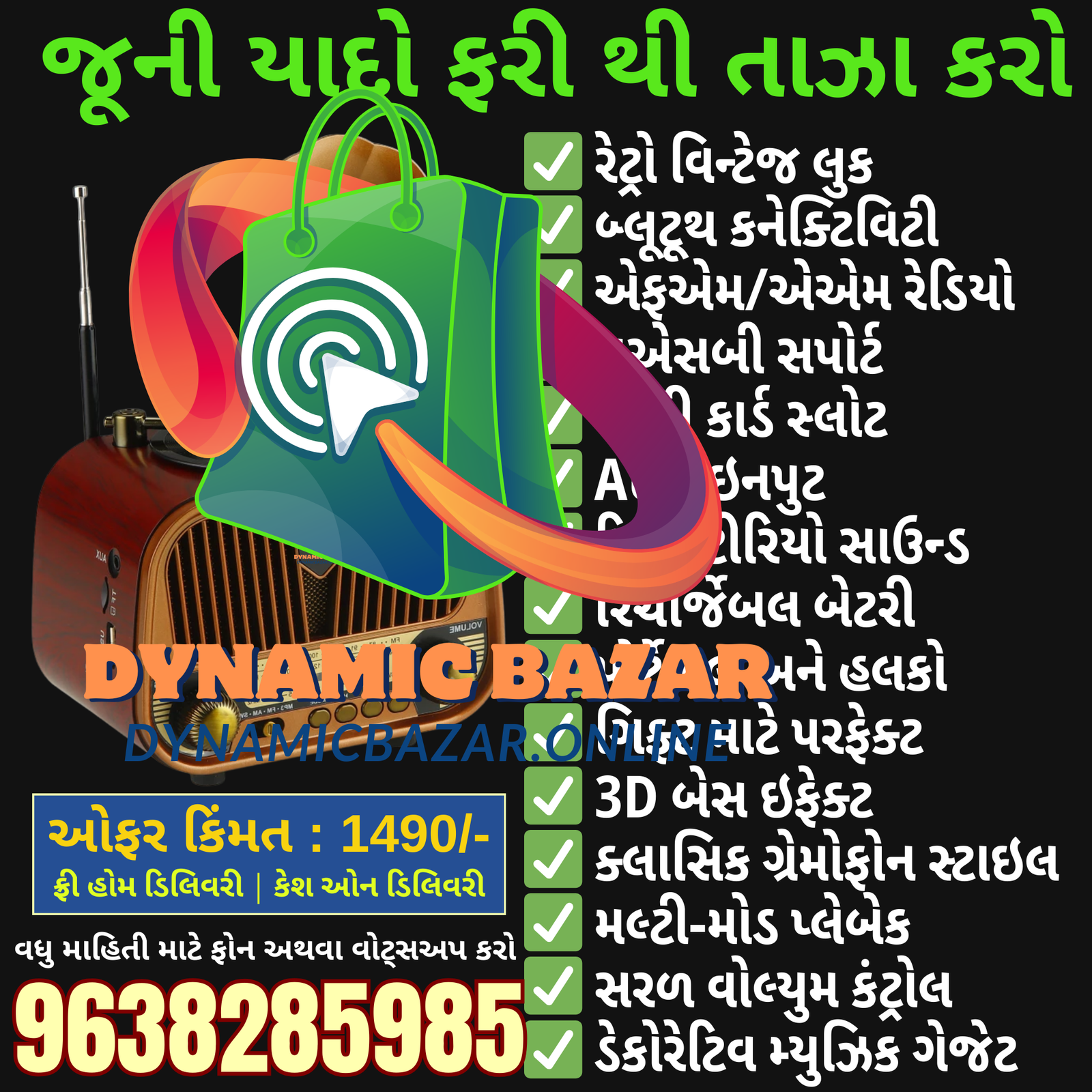 Dynamic Bazar™ રેટ્રો વિન્ટેજ બ્લૂટૂથ સ્પીકર એક ક્લાસિક ગ્રામોફોન સ્ટાઇલ ડિઝાઇન સાથે આવે છે, જે તમારા ઘર અથવા ઓફિસની સુંદરતા વધારે છે. આ સ્પીકર બ્લૂટૂથ દ્વારા મોબાઇલ સાથે વાયરલેસ મ્યુઝિક પ્લેબેક સપોર્ટ કરે છે તેમજ FM/AM રેડિયો, USB પેન ડ્રાઇવ, મેમરી કાર્ડ (TF) અને AUX ઇનપુટ જેવી મલ્ટી-મોડ પ્લેબેક સુવિધાઓ આપે છે.